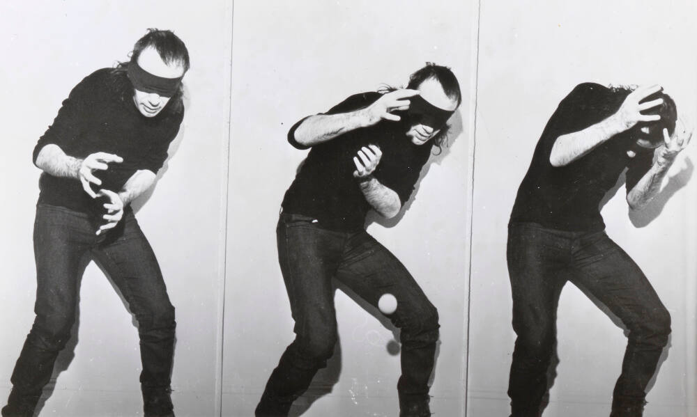 The performance then takes place: For three minutes, Acconci fails to catch balls thrown at him while cameras record both still and moving images. The resulting film and photographs on display here are key elements of Acconci’s artwork.