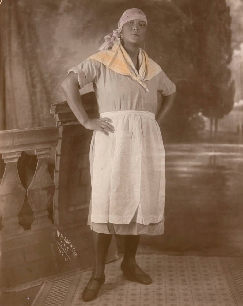 DescriptionHand-colored posed portrait of African-American woman standing confidently with hands on hips in front of a cardboard studio prop resembling a stone wall. She's wearing a dress with an apron and head scarf.Gallery LabelJames Van Der Zee was an African American photographer active during the Harlem Renaissance, an artistic and cultural movement of the 1920s. He photographed the vibrant black community both in and out of the studio. For portraits, he softened focus and hand colored his prints to achieve an aura of glamour. Most of his clients were affluent members of the black middle class, but all portraits received the same respectful attention to detail. Although the woman pictured here is not elegantly dressed, it doesn’t seem to matter: Van Der Zee has perfectly captured her confidence and spirit.