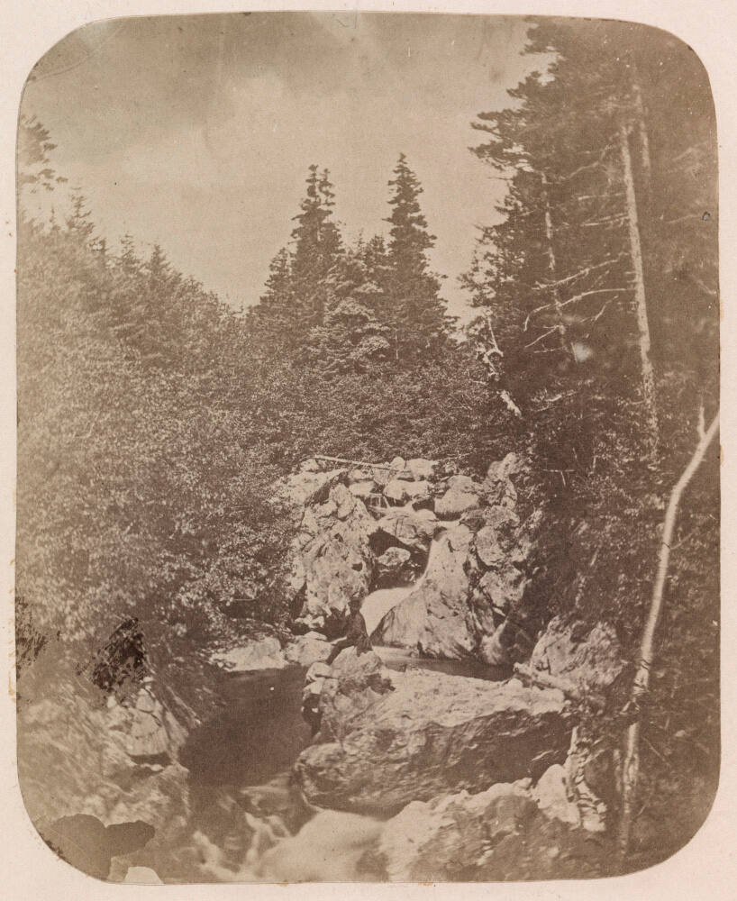 DescriptionScenic image of man seated on tiered rocks near river bed surrounded by trees.