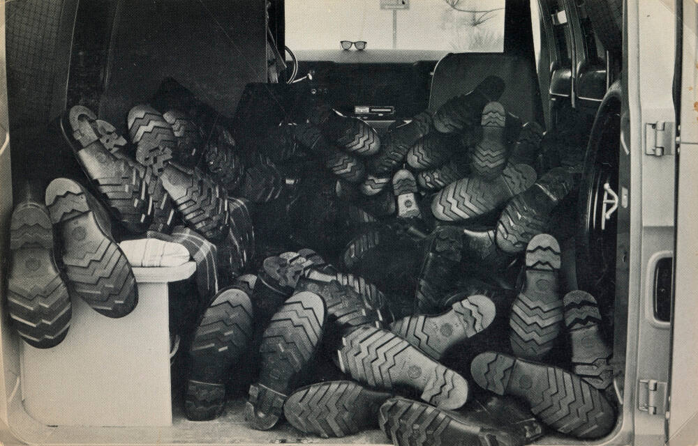 DescriptionImage of boots piled in the back of a van so only the soles are visible.Gallery LabelFrom 1971 to 1973, Eleanor Antin staged 100 rubber boots in various settings across the United States—riding a roller coaster, visiting a museum, marching up a hill—and mailed postcards of the images to 1,000 recipients. Each postcard includes a photograph of the boots, title, date, time, and place at which the picture was made. Antin chose boots, in part, to evoke military uniforms, a reference to the continuing death of American soldiers in the Vietnam War (1965–1973). Together, they convey a loosely structured narrative like a series of film stills.