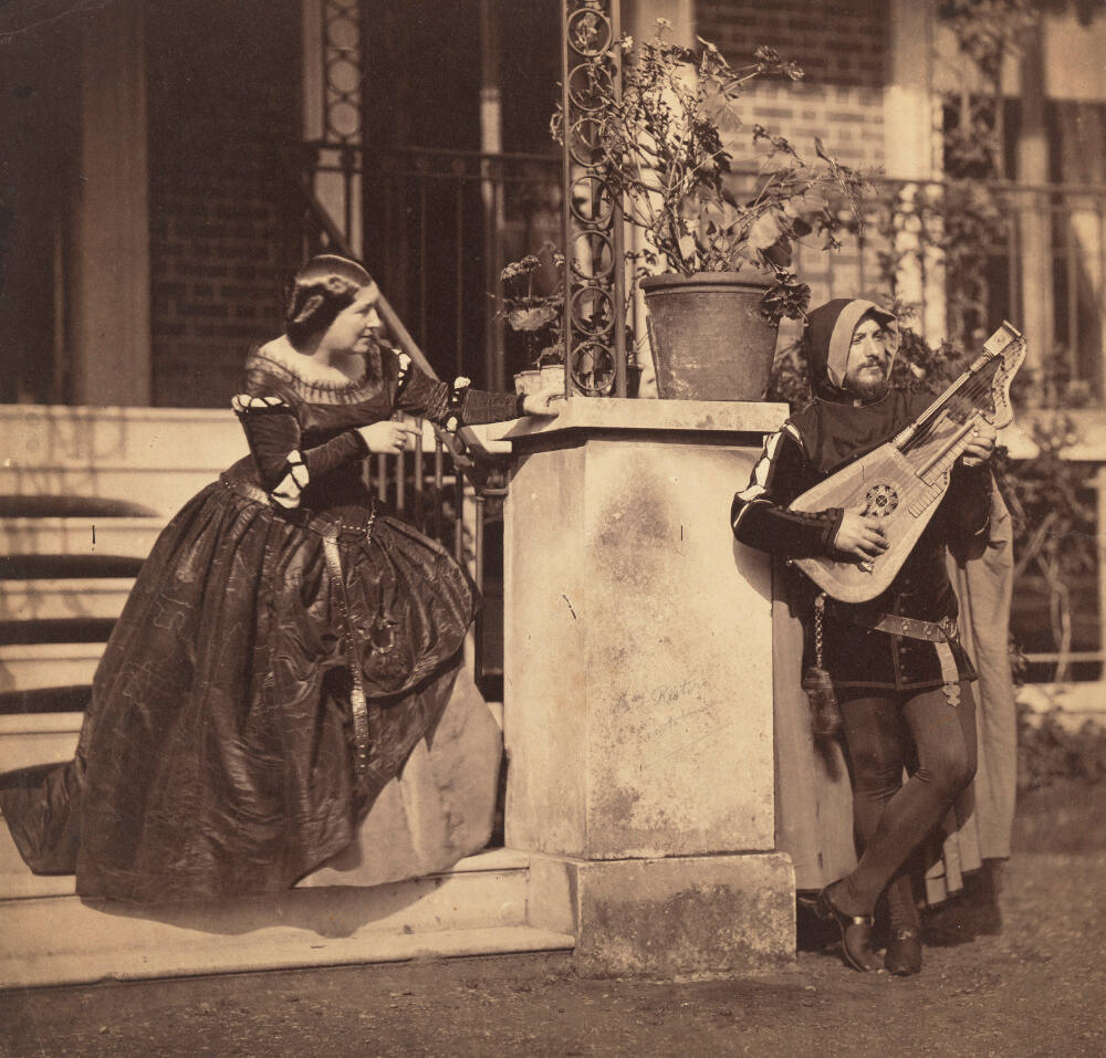 DescriptionImage of a man and woman each dressed in fancy costumes. The man plays a stringed instrument while the woman watches from the stairs.Gallery LabelFamed soprano Giulia Grisi (1811–1869) and her husband, tenor Giovanni Mario (1810–1883), reenact a scene from the Italian opera The Troubadour. Photographed in a Victorian garden rather than in a studio, the image’s setting is surprisingly at odds with the elaborate costumes and the opera’s dark themes of murder and revenge. The Troubadour debuted in 1853 to immediate international acclaim. In response, this image, taken by commercial photographic team Caldesi & Montecchi, was reproduced in various formats: for display, as illustration for sheet music, and as small, affordable, and collectible cartes-de-visite.