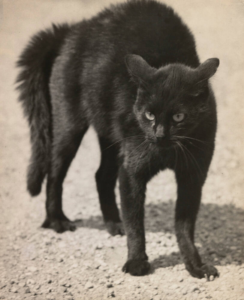 DescriptionImage of black cat standing on gravel with arched back, bent ears, and a puffy tail.ProvenanceThe Hall Family Foundation, Kansas City, MO, 2015;