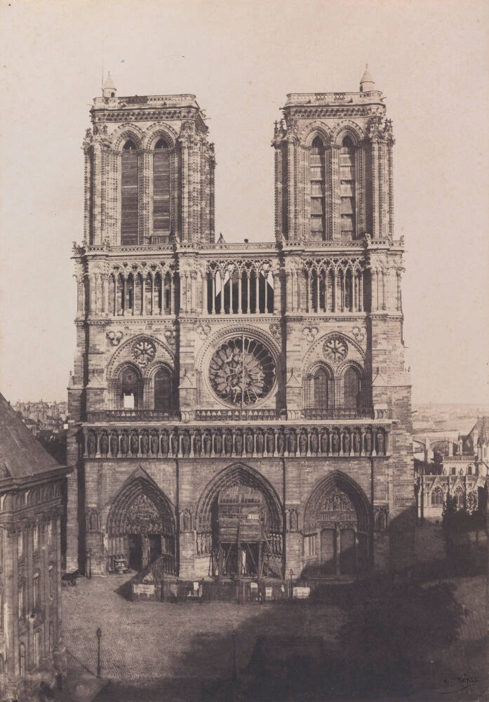 DescriptionImage of Notre-Dame's façade with center doors under construction. It is surrounded by a small wooden fence and a dark shadow hovers over the lower right corner.