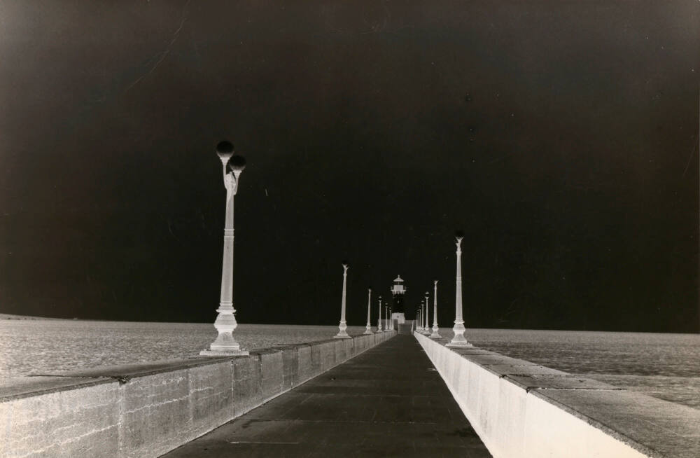 DescriptionSolarized image of a pathway lined with post lights and flanked with water. The path leads down to a tall structure, possibly a lighthouse.Copyright© The Ralston Crawford Estate