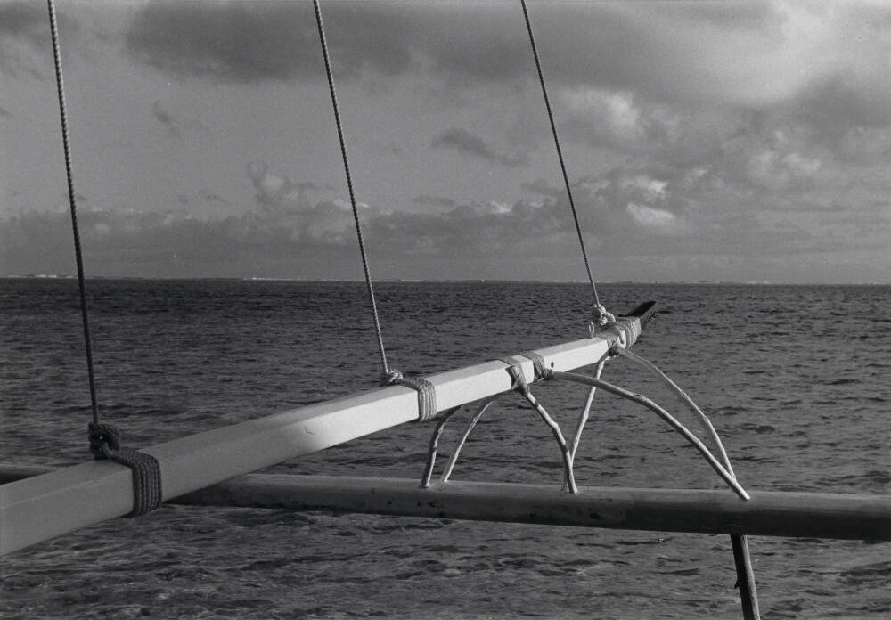 DescriptionImage of a tiller tethered with ropes extending out over a body of water with clouds in the sky.Copyright© The Ralston Crawford Estate