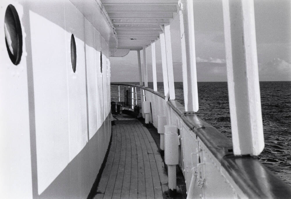 DescriptionImage of open air hallway on boat; small circular windows along the left looking out onto water.Copyright© The Ralston Crawford Estate