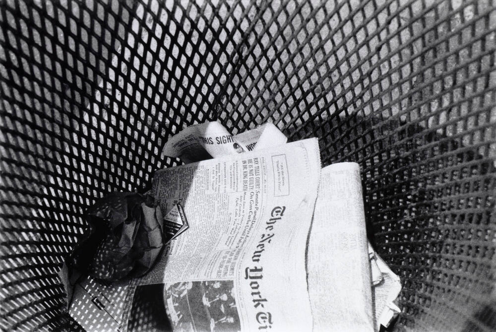DescriptionImage looking down into a metal trashcan with the New York Times Newspaper in the bottom.Copyright© The Ralston Crawford Estate