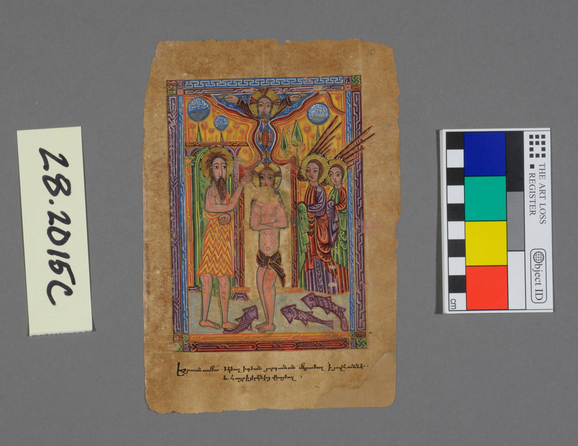 This heavily illuminated manuscript includes 40 full-page miniature paintings and 206 marginalia illustrations. The subject matter of the text and illustrations relate to the Armenian Christian tradition. The manuscript consists of the following texts: a prefatory cycle with illustrations from the Old Testament and the Life of Christ, illustrations of the ten canon tables (xorans), a letter of Eusebius to Carpianus, and the four Gospels of the New Testament. The prefatory cycle is heavily illustrated with 23 full-page miniature paintings, which have been removed and mounted. Other large illustrations are found at the beginning of each Gospel, which illustrates the patriarch opposite and illuminated frontispice.