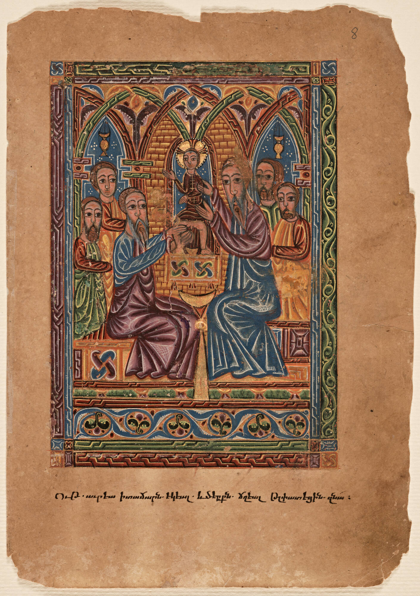 This heavily illuminated manuscript includes 40 full-page miniature paintings and 206 marginalia illustrations. The subject matter of the text and illustrations relate to the Armenian Christian tradition. The manuscript consists of the following texts: a prefatory cycle with illustrations from the Old Testament and the Life of Christ, illustrations of the ten canon tables (xorans), a letter of Eusebius to Carpianus, and the four Gospels of the New Testament. The prefatory cycle is heavily illustrated with 23 full-page miniature paintings, which have been removed and mounted. Other large illustrations are found at the beginning of each Gospel, which illustrates the patriarch opposite and illuminated frontispice.