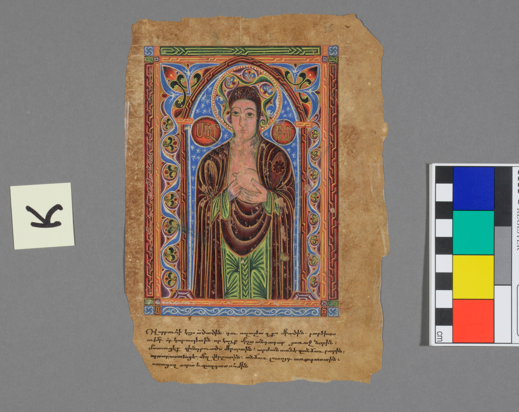 This heavily illuminated manuscript includes 40 full-page miniature paintings and 206 marginalia illustrations. The subject matter of the text and illustrations relate to the Armenian Christian tradition. The manuscript consists of the following texts: a prefatory cycle with illustrations from the Old Testament and the Life of Christ, illustrations of the ten canon tables (xorans), a letter of Eusebius to Carpianus, and the four Gospels of the New Testament. The prefatory cycle is heavily illustrated with 23 full-page miniature paintings, which have been removed and mounted. Other large illustrations are found at the beginning of each Gospel, which illustrates the patriarch opposite and illuminated frontispice.
