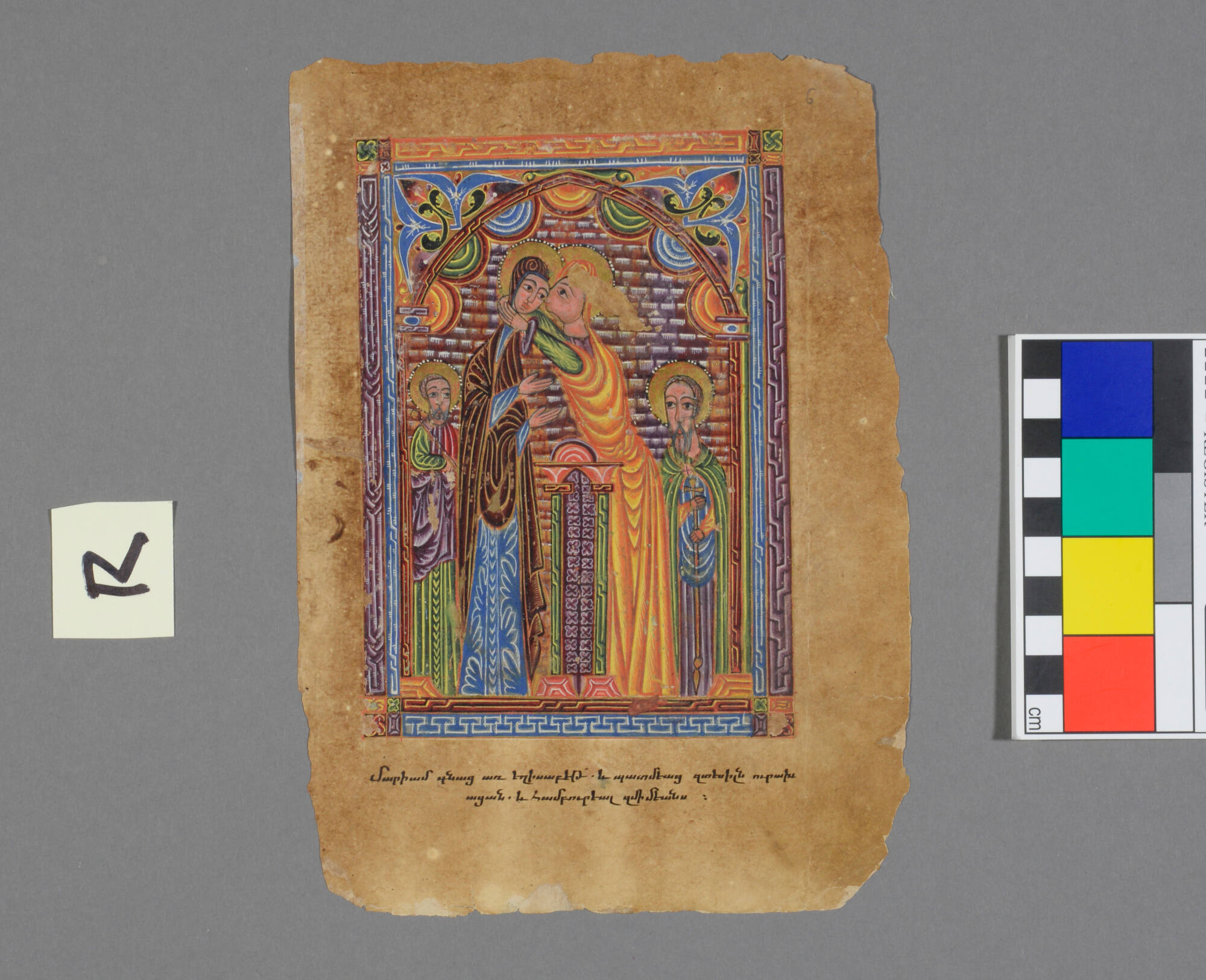 This heavily illuminated manuscript includes 40 full-page miniature paintings and 206 marginalia illustrations. The subject matter of the text and illustrations relate to the Armenian Christian tradition. The manuscript consists of the following texts: a prefatory cycle with illustrations from the Old Testament and the Life of Christ, illustrations of the ten canon tables (xorans), a letter of Eusebius to Carpianus, and the four Gospels of the New Testament. The prefatory cycle is heavily illustrated with 23 full-page miniature paintings, which have been removed and mounted. Other large illustrations are found at the beginning of each Gospel, which illustrates the patriarch opposite and illuminated frontispice.