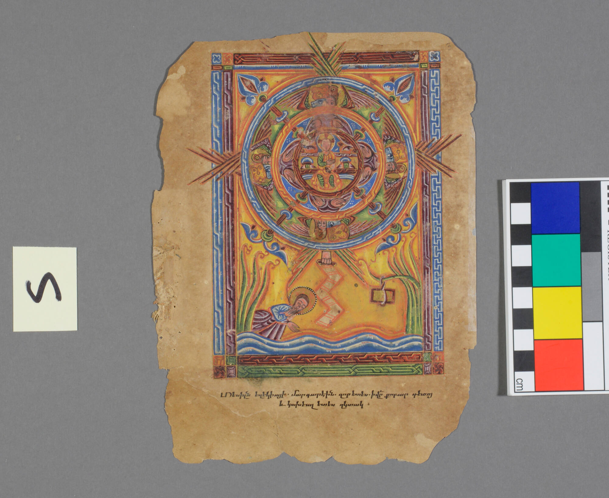 This heavily illuminated manuscript includes 40 full-page miniature paintings and 206 marginalia illustrations. The subject matter of the text and illustrations relate to the Armenian Christian tradition. The manuscript consists of the following texts: a prefatory cycle with illustrations from the Old Testament and the Life of Christ, illustrations of the ten canon tables (xorans), a letter of Eusebius to Carpianus, and the four Gospels of the New Testament. The prefatory cycle is heavily illustrated with 23 full-page miniature paintings, which have been removed and mounted. Other large illustrations are found at the beginning of each Gospel, which illustrates the patriarch opposite and illuminated frontispice.
