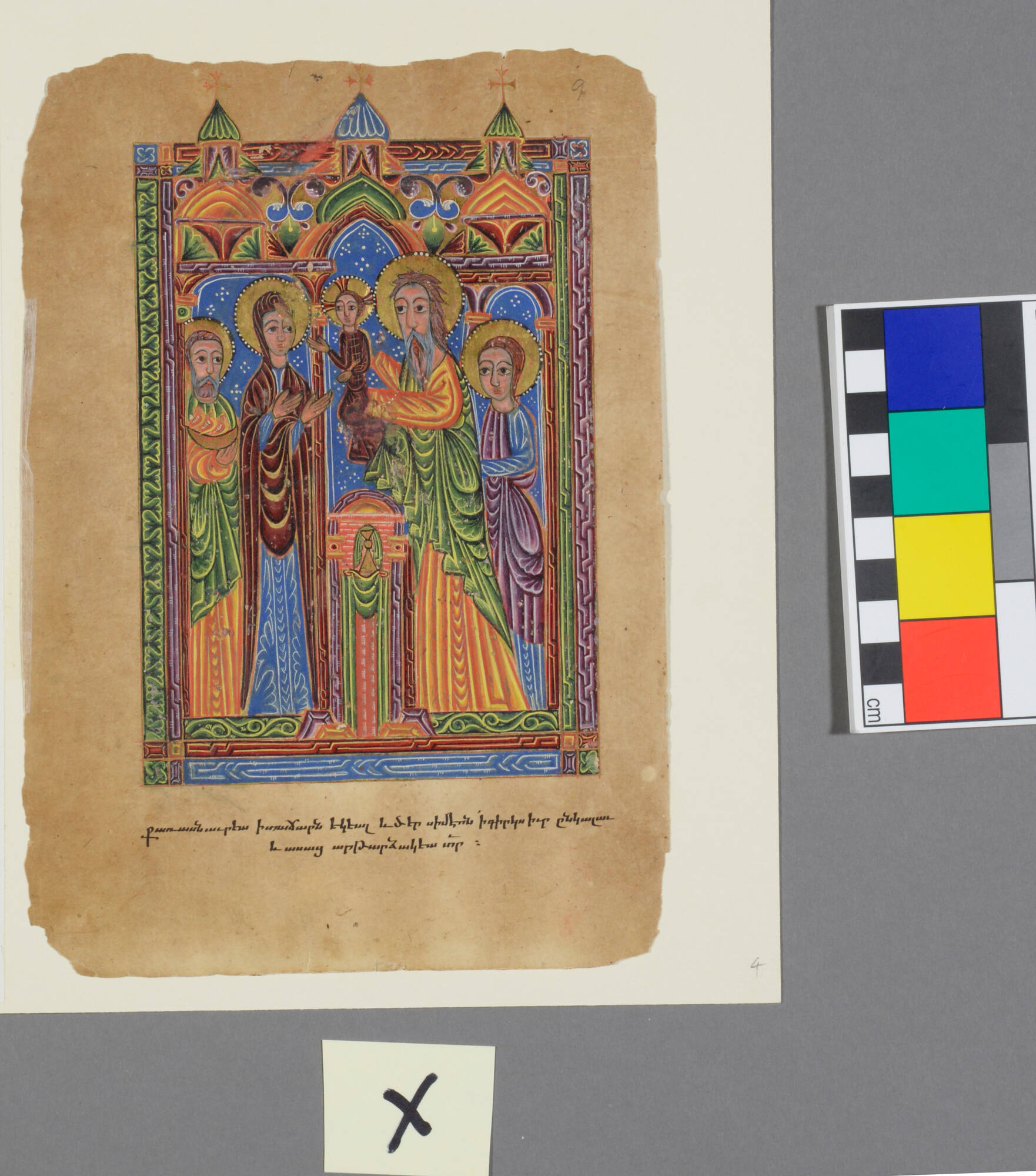 This heavily illuminated manuscript includes 40 full-page miniature paintings and 206 marginalia illustrations. The subject matter of the text and illustrations relate to the Armenian Christian tradition. The manuscript consists of the following texts: a prefatory cycle with illustrations from the Old Testament and the Life of Christ, illustrations of the ten canon tables (xorans), a letter of Eusebius to Carpianus, and the four Gospels of the New Testament. The prefatory cycle is heavily illustrated with 23 full-page miniature paintings, which have been removed and mounted. Other large illustrations are found at the beginning of each Gospel, which illustrates the patriarch opposite and illuminated frontispice.