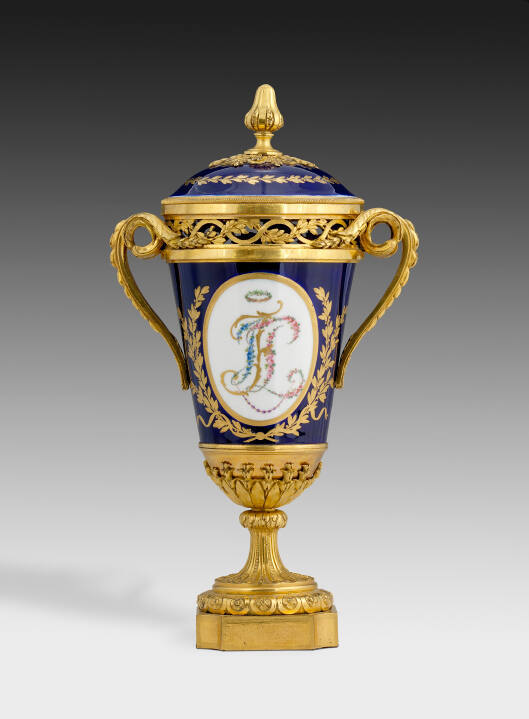 DescriptionCovered vase in royal blue, decorated with two monogram medallions, mounted in chased ormulu and having two ormulu voluted handles.Gallery LabelThe Sèvres porcelain manufacturer called upon the skills of fondeurs-ciseleurs (metal-casters and finishers) to enhance this pair of urns with elaborate gilded mounts. The first mounted Sèvres vases were recorded in 1764, but Chinese porcelains had been set in precious and semi-precious metals beginning in the Middle Ages, an indication of the medium's status as a rare and precious material deserving of such expense and treatment. Gilded mounts became very fashionable in 18th-century France and were also applied to furniture pieces. Just a year before mounted porcelains were introduced, Sèvres developed the deep, royal blue glaze (bleu nouveau) that serves as the ground for the unidentified "FB" monogram.