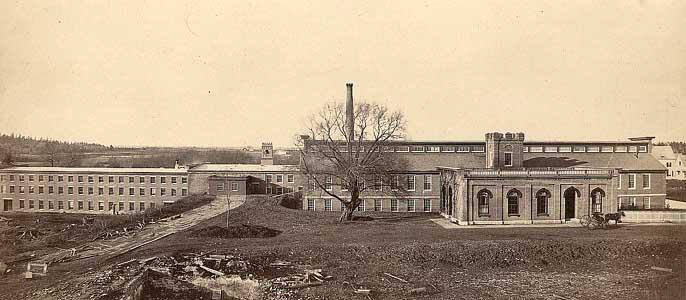 DescriptionImage of brick factory building with picket fence and horse drawn carriage near right edge. There is a partially constructed road leading up to the building along with branches and boards scattered in the foreground.