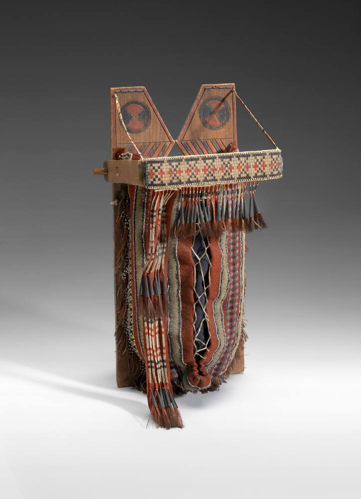 DescriptionDoll sized cradle with painted wood backboard and quill and beaded headboard and container and cloth wrap.Published ReferencesTorrence, Gaylord, ed. Continuum: North American Native Art at the Nelson-Atkins Museum of Art. Kansas City: Nelson-Atkins Museum of Art.