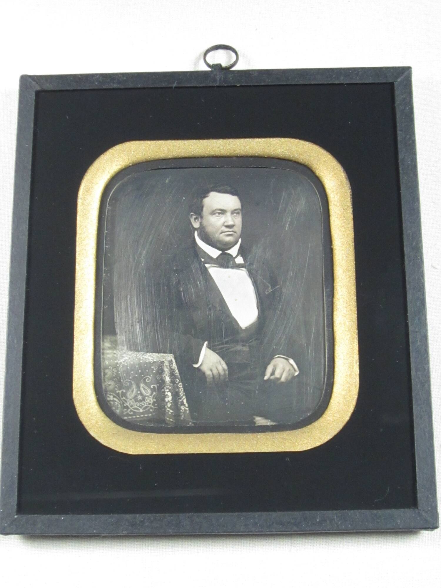 DescriptionQuarter plate uncased daguerreotype housed in gold and black mat and frame. Portrait of man seated wearing suit and tie with handpainted gold buttons on shirt.