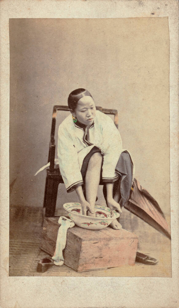 InscribedPrinted captions on paper, attached to mount verso, in black type: "Ablutions. / It is frequently asserted and general- / ly believed that Chinese women never / was their feet, --and to a certain extent / this belief is correct, inasmuch as the small footed women do not, and cannot / remove the oppressive bandages which / confine their feet to the unnatural shape / peculiar to most of their sex in China. -- / Nevertheless all women in China are / not artificially deformed by having their / feet tortured into the "fashionable" / shape--and that those who allow nature / to be unrestrained, do perform abluti- / ons--this picture is a proof."