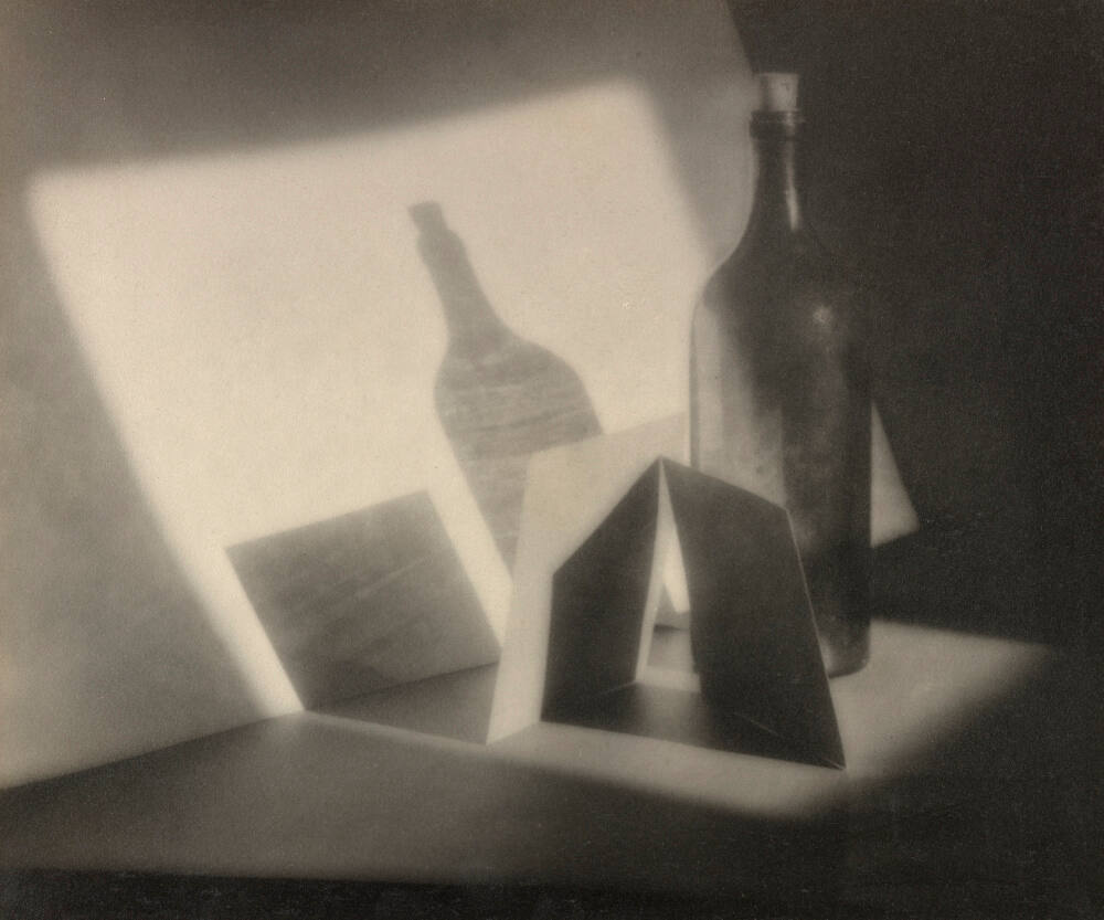 DescriptionImage of still life with bottle, abstract forms, and shadows which resemble photograms.Provenance