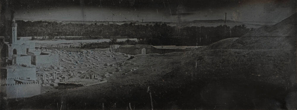 DescriptionPanoramic image of ancient city with steep hill next to stone building. This unique sized uncased daguerreotype is housed between two sheets of glass and sealed with brown paper tape.