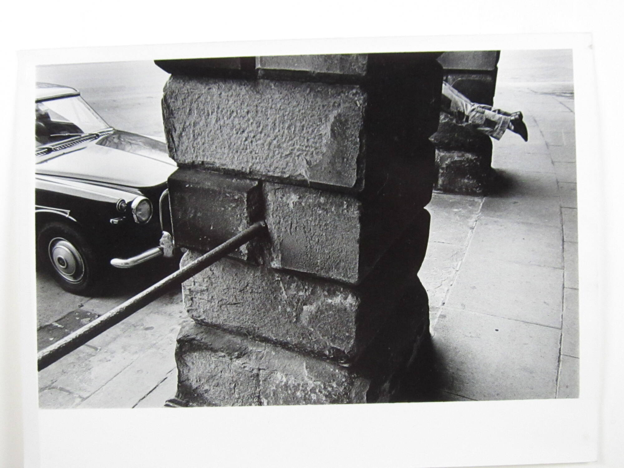 DescriptionImage of incongruous juxtaposition of stone pillar with a person's legs outstretched in midair directly behind.Exhibition History