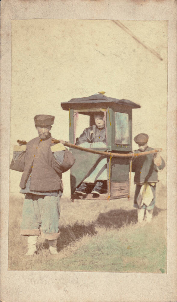 DescriptionHand colored image of man in a small covered chair (litter) which is being carried on the shoulders of two others; they are wearing hats, layered pants, and jackets while walking through grassy landscape.