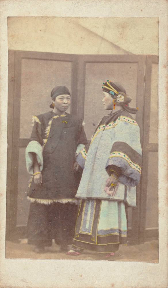 DescriptionHand colored image of two women standing in front of a screen wearing nice garments. One woman's jacket is trimmed with fringe and the other woman's jacket is embellished on the sleeves as well as on the headdress - she also appears to have tiny, possibly bound, feet.