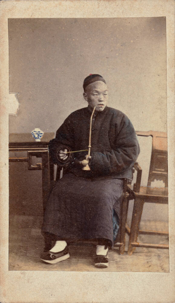 DescriptionHand colored image of a Compradore seated next to table and chair and holding pipe.