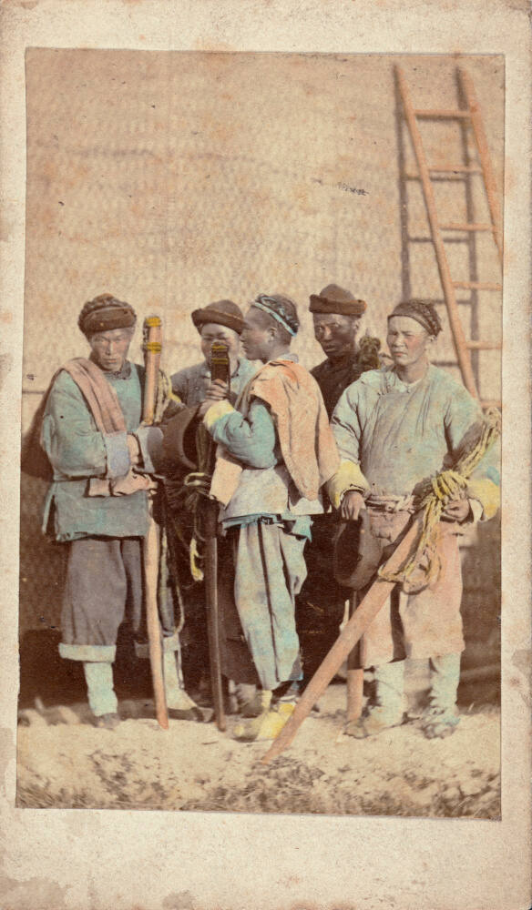 DescriptionHand colored image of five men standing near wall with ladder; they each hold a long bamboo stick and one squints his eyes as he faces the sun.