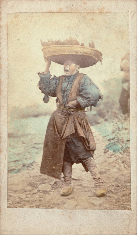InscribedPrinted captions on paper, attached to mount verso, in black type: "Crying Vegetables. / One often hears of a "speaking like- / ness, but this is more--it is shouting / distinctly!--and gives a good idea of / the sort of perambulating vendors who / salute the ear with unintelligible cries. / It would be difficult to tell the sex of / the individual shown in this photograph, / did not we know that women always / wear trousers in China, and men the sort / of loose fitting stocking shown herein.--"