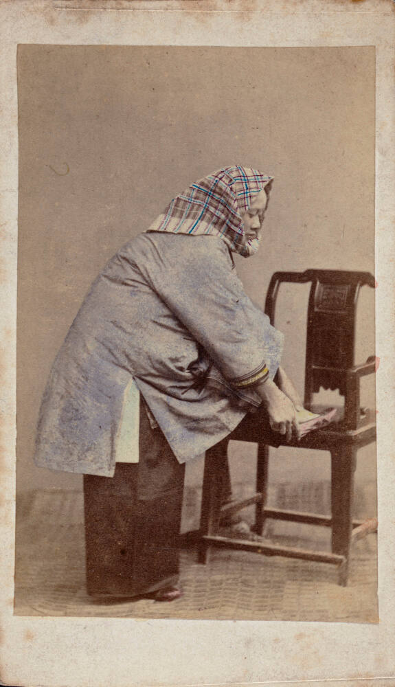 InscribedPrinted captions on paper, attached to mount verso, in black type: "Natives of Macao. / THESE girls who may always be distin- / guished by the gay coloured handker- / chiefs thrown over the head, are seen / at most of the open ports in China. / They are not pure Chinese, but are / generally of mixed blood, sometimes of / Portuguese descent on one side. / ¶ They are as a rule extremely pretty, / and wear the Chinese dress, but their / moral character is frequently doubtful. / Their complexions are fairer than the Chinese, and sometimes when young they may be termed beautiful."