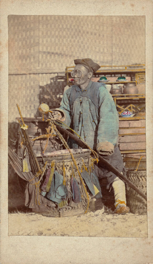 DescriptionHand colored image of man with large spectacles pedaling his wares. He's playing with a hand held drum and is surrounded by large baskets and small vessels.
