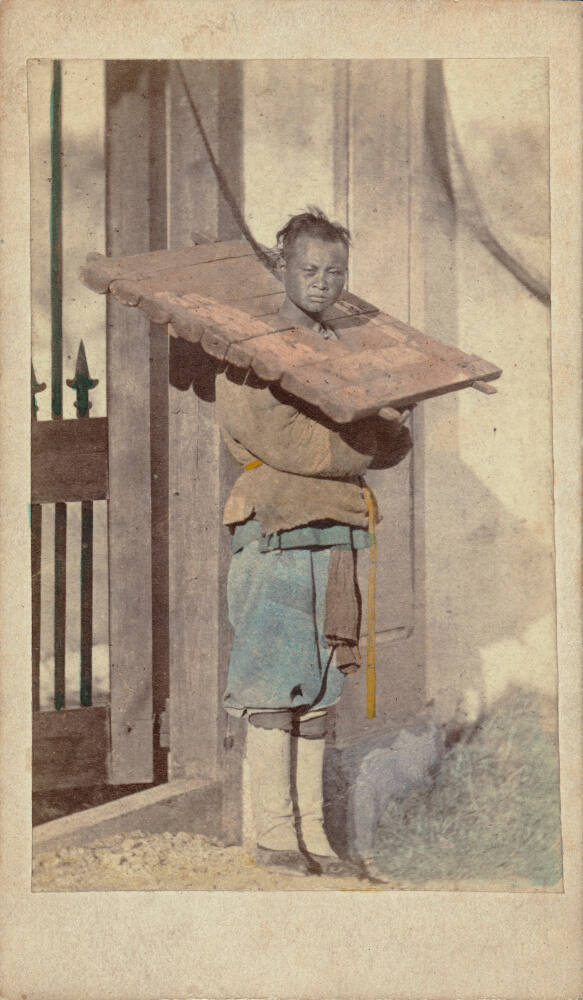 InscribedPrinted captions on paper, attached to mount verso, in black type: "Punishment of the / Cangue. / Public Exposure in the Cangue is one / of the five legal punishments of the Chi- / nese Code. The Cangue itself is a wood- / en frame, weighing somewhere about / twenty five pound, which is fastened / round the neck, and rests on the shoul- / ders, and is broad enough to prevent / the prisoner from feeding himself / The name of the delinquent, and / his offence are attached, and his tail is / fastened so as to prevent escape, but the / punishment is not like others in the legal / Code, a painful one.-- / ¶ The offender is generally fastened / during the day to some public fastened / during the day to some public spot ad- / jacent to where his crime was committed, / and removed to prison at night.--"
