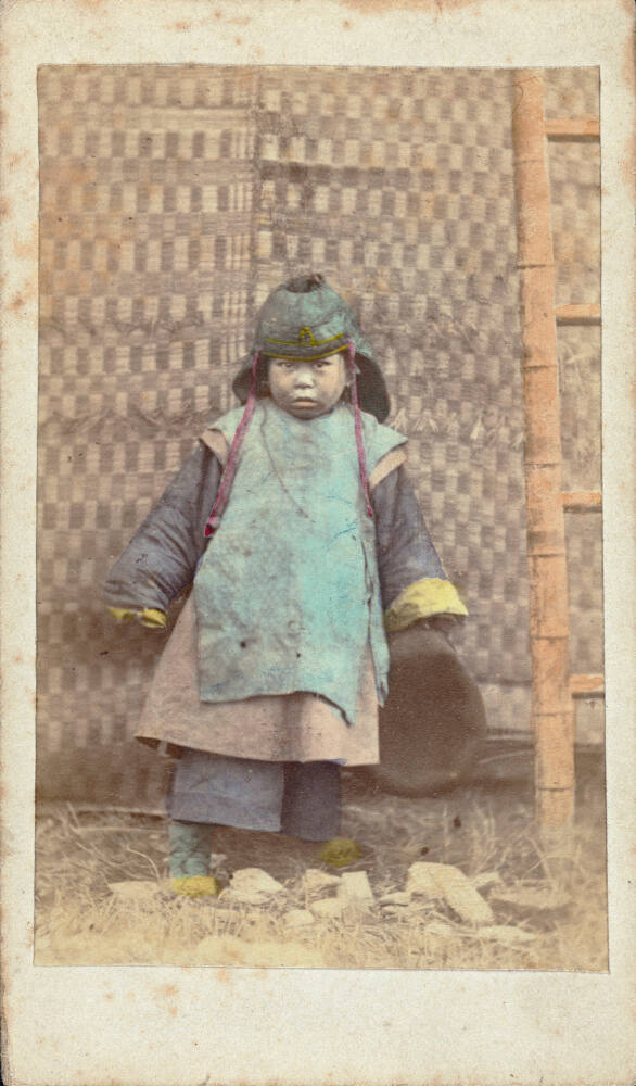 InscribedPrinted captions on paper, attached to mount verso, in black type: "Small piecy bull chilo. / The definition of sexes in Chinese / "Pidgin" English is peculiar, a little boy / being always called a "bull chilo" and / a little girl a "cow chilo"! and so per- / severingly do they adhere to their errors / in English, and so pertinaciously do they / object to any alteration in the terms / which they first picked up in their early / intercourse with Foreigners--that Pidg- / in English is now a language printed / and taught in their schools at Canton. / ¶ One sensible peculiarity may be no- / ticed in the dress of the children--they / have not such abomination as the "pina- / fore" (which invariably ties behind), but / the dress fastens at the side."