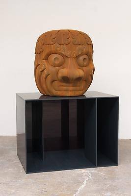 DescriptionLarge terra cotta head of an anthropomorphisized snake resting on an aluminium base of rectinlear design with Plexiglas inserts.Copyright© Nathan Mabry