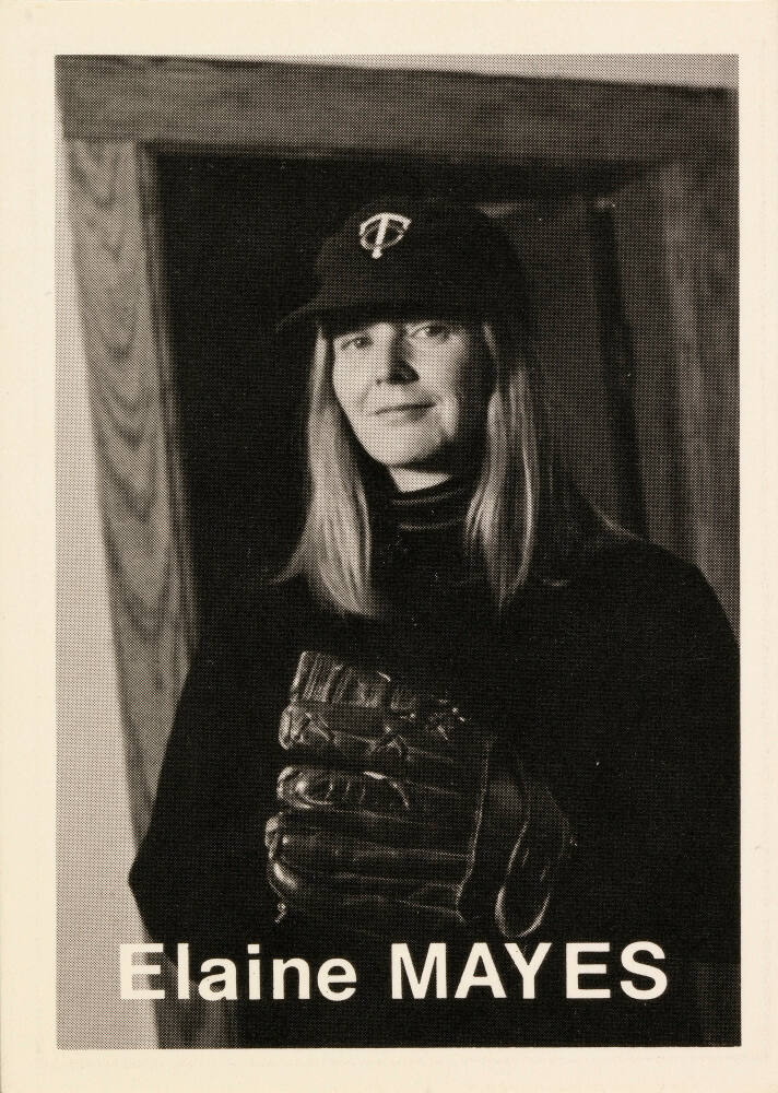 Statistics and quote by respective artist printed on card verso, in black: "Height: 5’ 4 ½” / Weight: 120 / Born: Berkeley, Ca. / Home: Florence, Mass. / Throws: Right / Bats: Right FP: Portriga / FC: Autographic FF: VP 122/ FD: FG-7/ FPh: Bill Arnold / Elaine Mayes / Elaine saw her first Big League / game in Washington D.C. in 1948. / (Orioles vs. Senators) She also / began taking pictures that year with / a Kodak Brownie given to her by her / aunt. Two years later, she gave up / baseball but continued with photo- / graphy.”