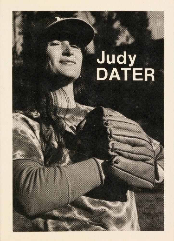 Statistics and quote by respective artist printed on card verso, in black: "Height: 5’ 6” / Weight: 122 / Born: Hollywood, Ca. / Home: San Anselmo, Ca. / Throws: Right / Bats: Right FP: Agfa Brovira / FC: Deardorff FF: Ilford FP4 / FD: Rodinal / FPh: August Sander / Judy Dater / They say behind every great man / there’s a woman. Well, the reverse / is true too. ‘Course I’m not brag- / gin’ or nothin’, but I owe it all to / my husband, Jack Welpott, who taught / me everything I know. Almost every- / thing that is."