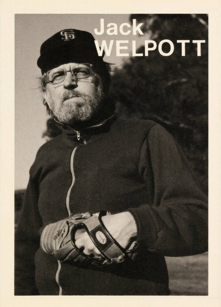 InscribedName printed on sheet recto, upper right, in white: "Jack / WELPOTT" Statistics and quote by respective artist printed on card verso, in black: "Height: 5’ 7” / Weight: 160 / Born: Kansas City, Kan. / Home: San Anselmo, Calif. / Throws: Right / Bats: Right FP: Agfa / FC: Deardorf FF: Ilford FP4 / FD: Rodinal / FPh: Judy Dater / Jack Welpott / To be or not to be – Shakespeare / To do is to Be – Camus / To Be is to Do – Lao Tse / Shoo-Be-Doo-Be-Do – Sinatra” "