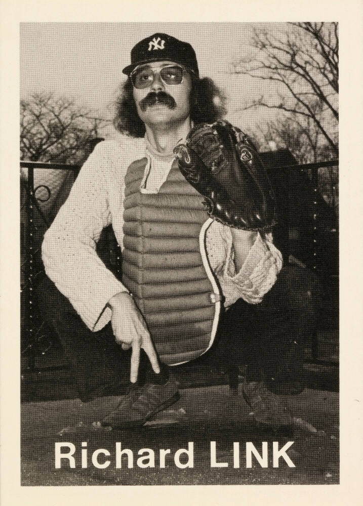 Statistics and quote by respective artist printed on card verso, in black: "Height: 6’ 1” / Weight: 156 / Born: The Bronx / Home: Buffalo / Throws: Right / Bats: Right FP: Agfa / FC: Nikon FF: Plus-X / FD: Benzodol F3 / FPh: Weegee / Richard Link / My father played semi-pro baseball / for the Bronx Cats until a foul tip / broke his nose. He always wanted / me to be a baseball player but I / thought photography was safer."