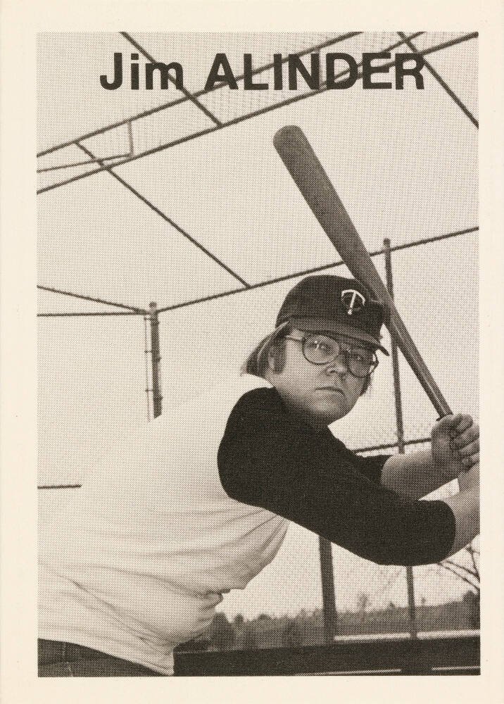 Statistics and quote by respective artist printed on card verso, in black: "Height: 5’ 11”/ Weight: 187/ Born: Glendale, Calif. / Home: Lincoln, Nebraska / Throws: Left / Bats: Left FP: / FC: Panon FF: / FD: / FPh: changes with the / season. / Jim Alinder / An exciting speedster, Jim took / over the Twins’ first base post / midway through the 1974 season and / figures to be a fixture there for / years to come. A demon on the / bases, he led the club with 34 / stolen bases during the season."
