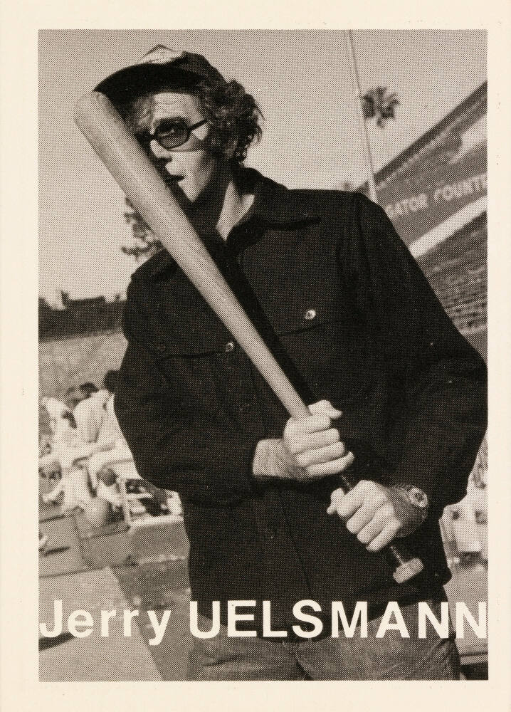 InscribedName printed on sheet recto, bottom, in white: "Jerry UELSMANN" Statistics and quote by respective artist printed on card verso, in black: "Height: 6’ 3”/ Weight: 185 / Born: Detroit, Michigan / Home: Gainesville, Fla. / Throws: Right / Bats: Right FP: Varilour / FC: Bronica FF: Plus-X / FD: Microdol-X / FPh: Jerry Uelsmann / When I was young, I defined baseball / as outer expression of inner growth. / I can’t define baseball any better / today, but my game has changed. Base- / ball isn’t something to be learned / from books of rules, it’s a living / thing which depends upon full par- / ticipation, as we grow in life, so / we grow in baseball, each of us in / his unique way."