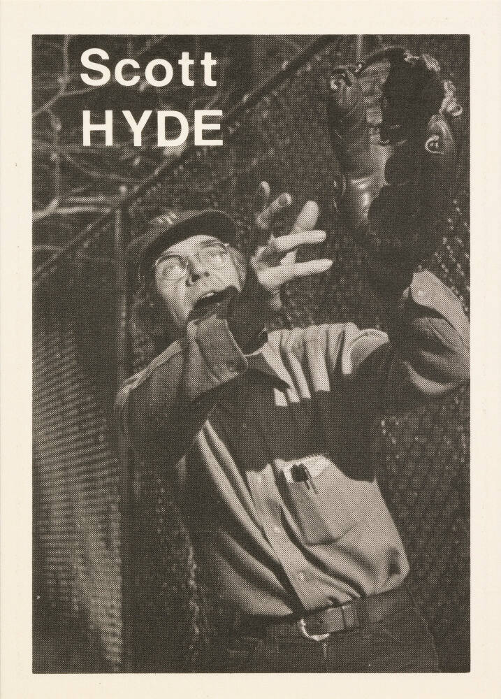 Statistics and quote by respective artist printed on card verso, in black: "Height: 5’ 11” / Weight: 144 / Born: Montevidio, Minn. / Home: N.Y.C. / Throws: Right / Bats: Right FP: National Enquirer / FC: my simpro-X FF: Kodalith / FD: Fineline / FPh: Yusef Karsh / Scott Hyde / Now a lot of young fellows come up / form the minors and they say to me / “I want to be a Big Super-Star like / you Mr. Hyde” and I say to the, / “Forget it kid, forget your petty / star ambitions, it’s teamwork that / really counts in this game, and also / in the game of life! All I ever did / was for the team!"