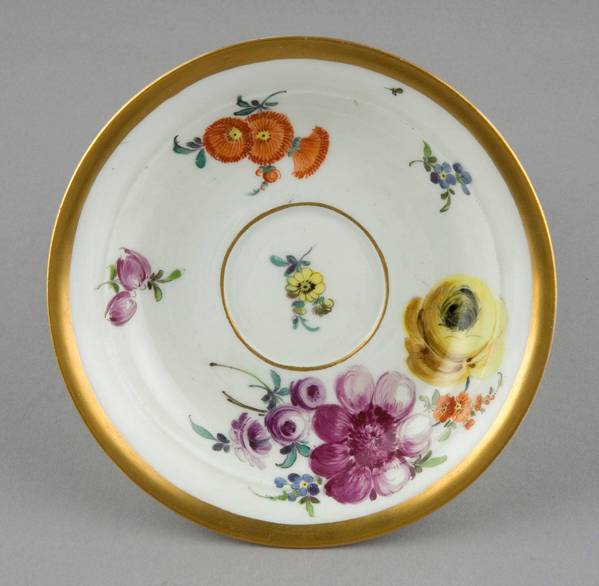 DescriptionCup: white porcelain with swan's neck handle and gilt rim; bulbous sides; decorated with enameled multicolored flower designs. Saucer: gilt rim; decorated on inside with enameled multicolored flower designs.ProvenanceMargaret Cameron Chapman (née Mann, 1865-1935), Kansas City, MO, by 1935;