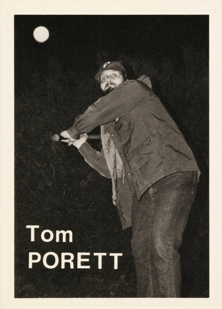 Statistics and quote by respective artist printed on card verso, in black: "Height: 5’ 8” / Weight: 183 / Born: Chicago / Home: Philadelphia / Throws: Right / Bats: Right FP: Cibachrome / FC: Olympus Pen FF: PCF / FD: E-4 / FPh: Weegee / Tom Porett / Currently player/manager (shortstop) / of the Silver Islet Nuggest (Ontario, / Canada), having worked up through / the organization from beer bottle / opener. Also avid fan of the Phila. / Flyers hockey team. When not totally / absorbed in above affairs, my spare / time is devoted to making pictures / and electronic music."