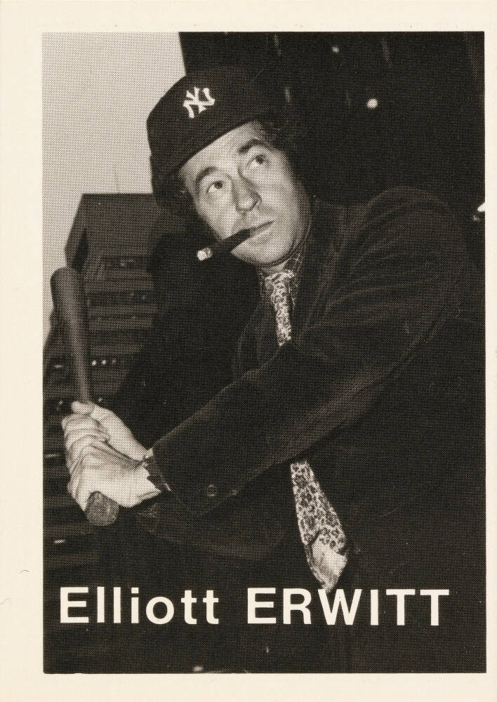 DescriptionIndividual "trading card" with portrait of Elliott Erwitt wearing velvet jacket, tie, and baseball cap while holding bat and smoking cigar.