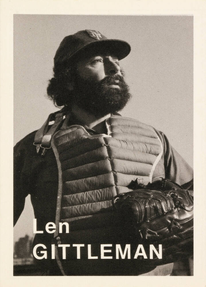 Statistics and quote by respective artist printed on card verso, in black: "Height: 5’ 8” / Weight: 175 / Born: Brooklyn / Home: Watertown, Mass. / Throws: Right / Bats: Right FP: N.Y. Times / FC: Leica M-1 FF: Kodalith / FD: Sprint / FPh: Harold Edgerton / Len Gittleman / Light Sensitive Pancakes: / Blend: / 2 eggs / 2 tbs. vegetable oil / 1 cup milk / ½ cup wheat germ / 1 tsp. baking powder / 2 pinches salt / Then add enough flour to make a / batter. "