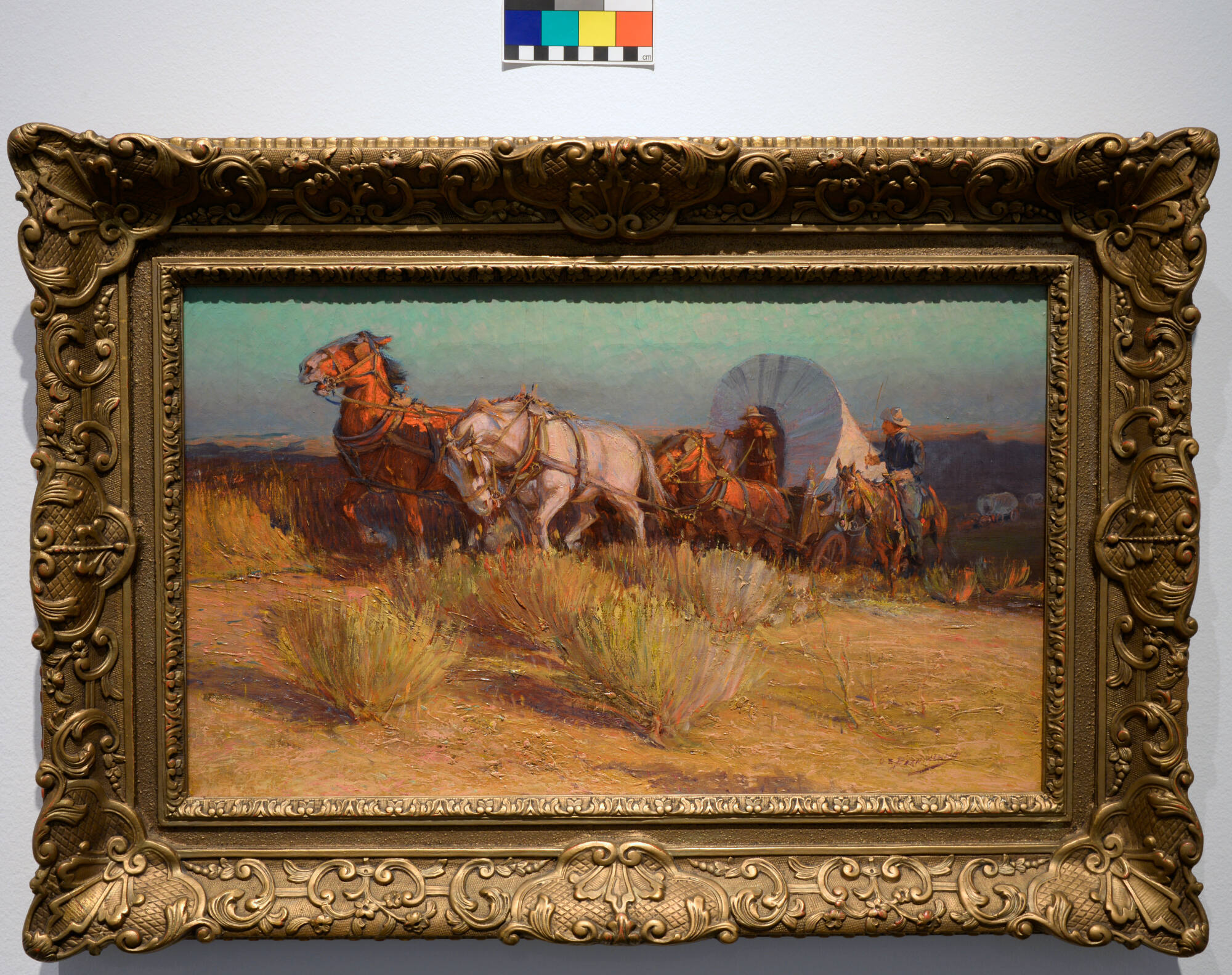 DescriptionThis horizontally-oriented painting represents three horses pulling a covered wagon (or “prairie schooner”) through a desert landscape. The horses, two brown and one white, strain against the weight of the wagon. A fourth horse is implied but not pictured. They are driven by a figure wearing brown who is standing at the front of the wagon. He is assisted by a man on horseback to the right of the wagon who is wearing blue and holding a riding whip. Two additional, sketchily-painted wagons are being pulled through the landscape behind the primary wagon. In the foreground of the picture, sagebrush is painted with a heavy buildup of paint and varied color in clumps. These desert grasses fade into hills, which are either tan or shadowed in purple against a sky painted with shades of turquoise.