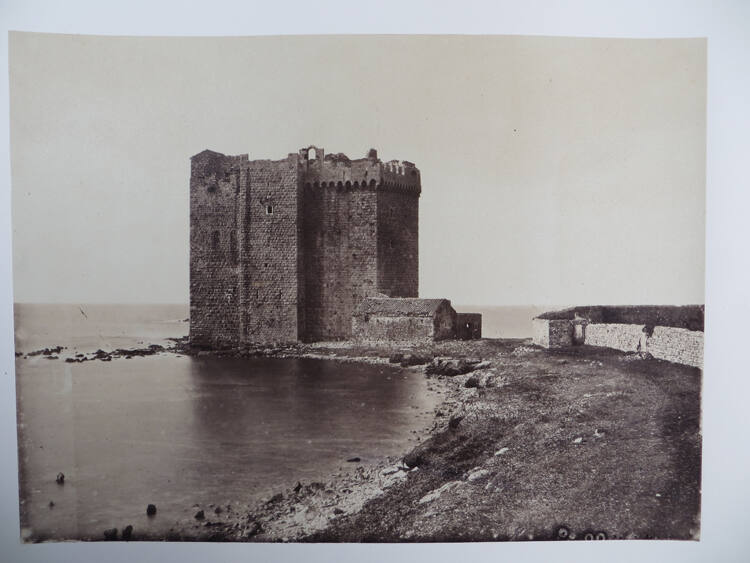 DescriptionImage of monastery with crumbling stone facade constructed along rocky shoreline.Provenance