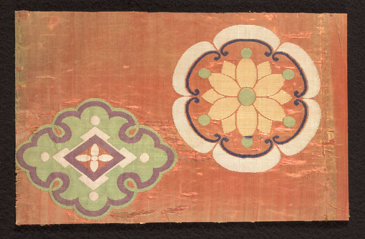 MediumOrange ground silk with yellow, purple, green, and white brocade