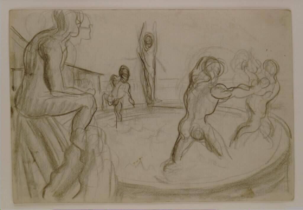 DescriptionThe drawing is in a black medium on beige paper and shows one large figure seated by a circular pool and two muscular figures jostling with each other in the pool. To the left of the composition's center, one figure stands on the rim of the pool with his arms raised and another figure climbs out of the pool.